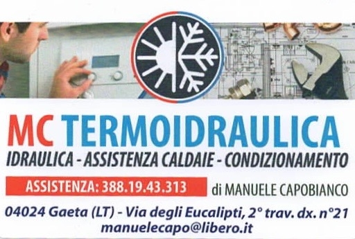 Idraulico a Latina Indirizzo: Via degli Eucalipti, 21, 04024 Gaeta LT, Italia Sito web: https://mctermoidraulica.com/ Rating: 4/5 **** (4 recensioni) Telefono: 0771 017411